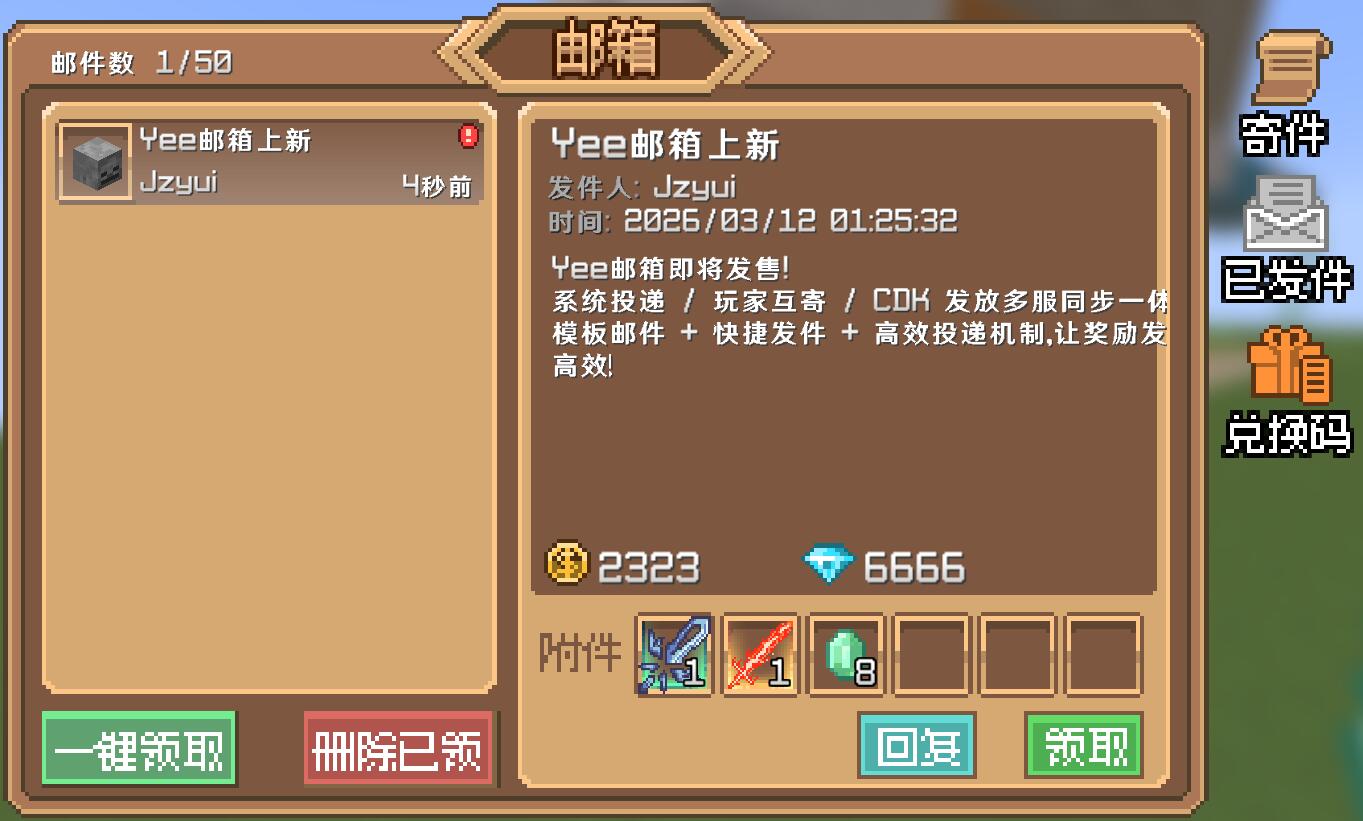 一款开箱即用、功能全面的邮箱插件,支持系统投递、玩家互寄、CDK 发放和多服同步,高效投递系统让奖励投递更简单、更省心